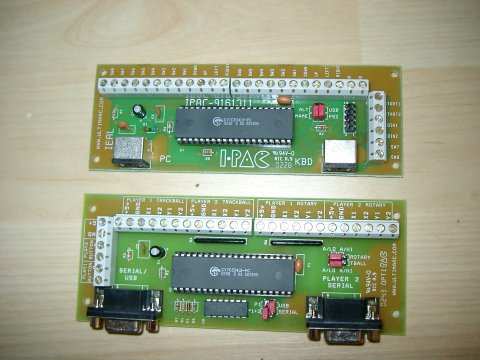 My two control interfaces, an iPAC for the joysticks and push buttons, and an OptoPAC for the trackball and spinner.